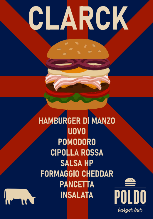 • Panino Clarck: hamburger di manzo, uovo, pomodoro, cipolla rossa, salsa hp, formaggio cheddar, pancetta, insalata